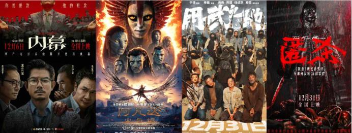 目前已有《阿凡达:火与烬》《内幕》《比如父子》等 30 多部影片定档 12 月,亦有《匿杀》《用武之地》《无名之辈:意义非凡》《过家家》等多部宣布进军元旦档。1 月也有《爆水管》《飞行家》等多部提前布局。
