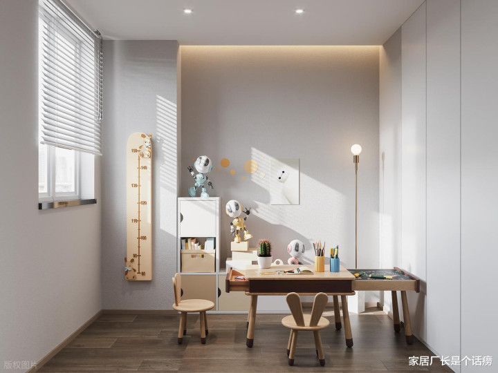 如果家里有小孩,那么未来5-10年,家的主题是“陪伴与成长”。可能需要牺牲一部分美观,预留宽敞的玩耍区,选择耐脏好打理的材质,家具要圆润防磕碰,墙面甚至可以留出一片涂鸦墙。