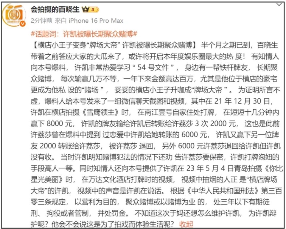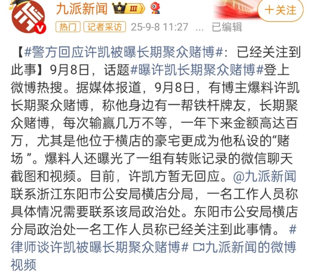 现在就希望有关部门注意到情况后,进行调查还原真相吧,也希望许凯和公司尽早回应,到底有没有赌博!