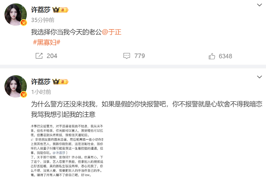 目前除了狗仔爆料,许荔莎也不断喊话于正回应,直言如果是假的话,于正应该报警来抓她,自己等着呢。由此可见,许荔莎胸有成竹并不害怕于正许凯,也更加说明了这事情的真实性。