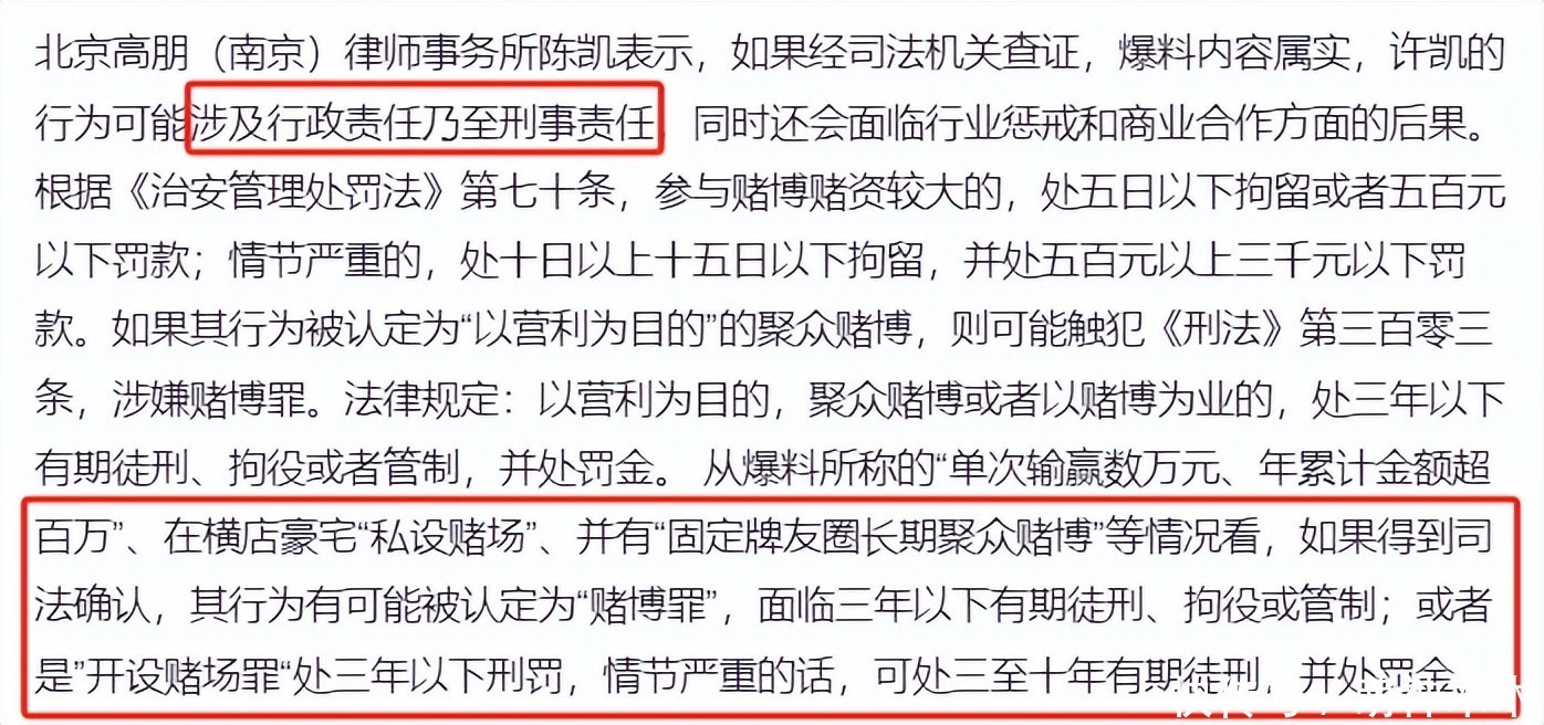 我们也去咨询了专业律师,许凯涉及的赌博罪,虽然判不了多重,但单纯赌博也要面临三年以下。反正横看竖看,许凯都违法了。